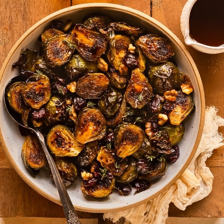 Crispy roasted sprouts are glazed with pure maple syrup and tossed with tart dried cranberries and crunchy nuts for a perfect sweet‑savory balance. Made with just a handful of ingredients and little prep, it’s a crowd‑pleasing side that can be prepped ahead for holiday feasts.