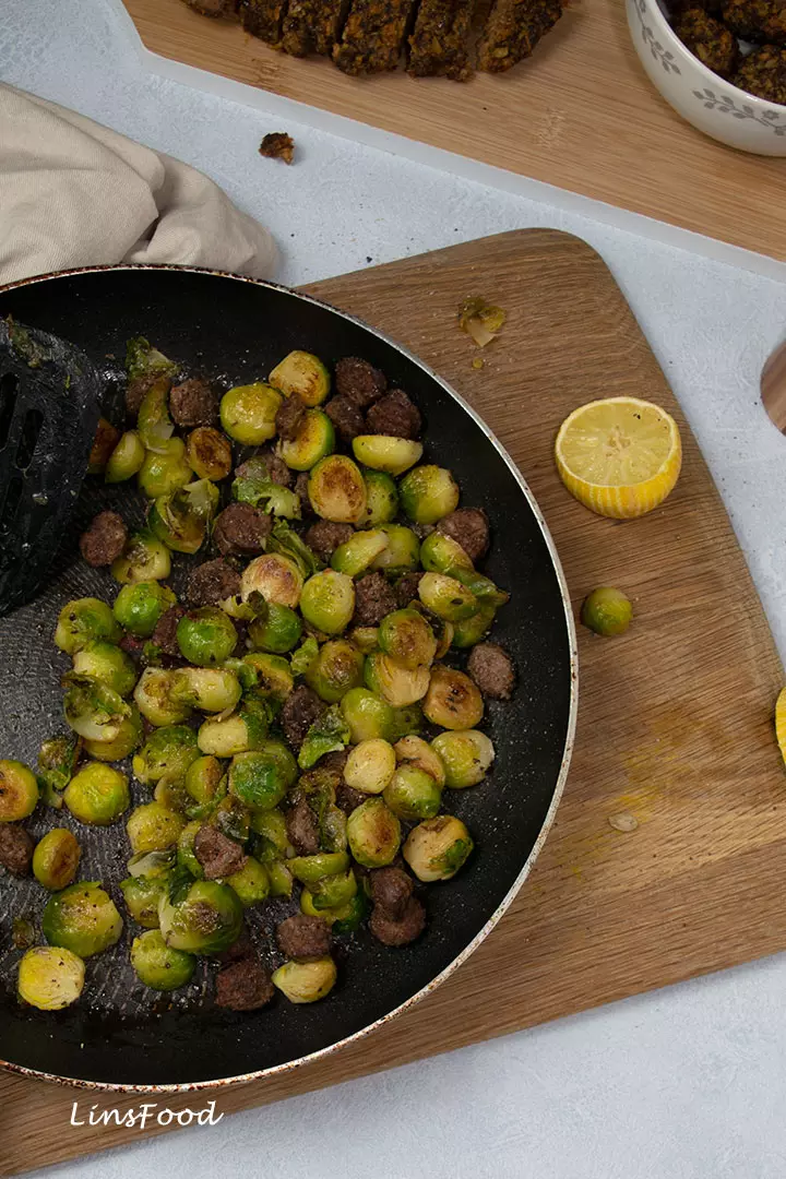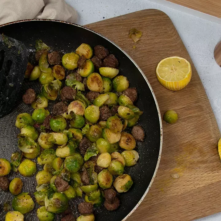 Parboiled Brussels sprouts are fried with fresh chorizo, whose smoky, sweet and spicy notes give the vegetables ‘attitude’. The dish uses few ingredients and is quick to prepare, making it a meaty, vibrant alternative to bacon-based recipes.