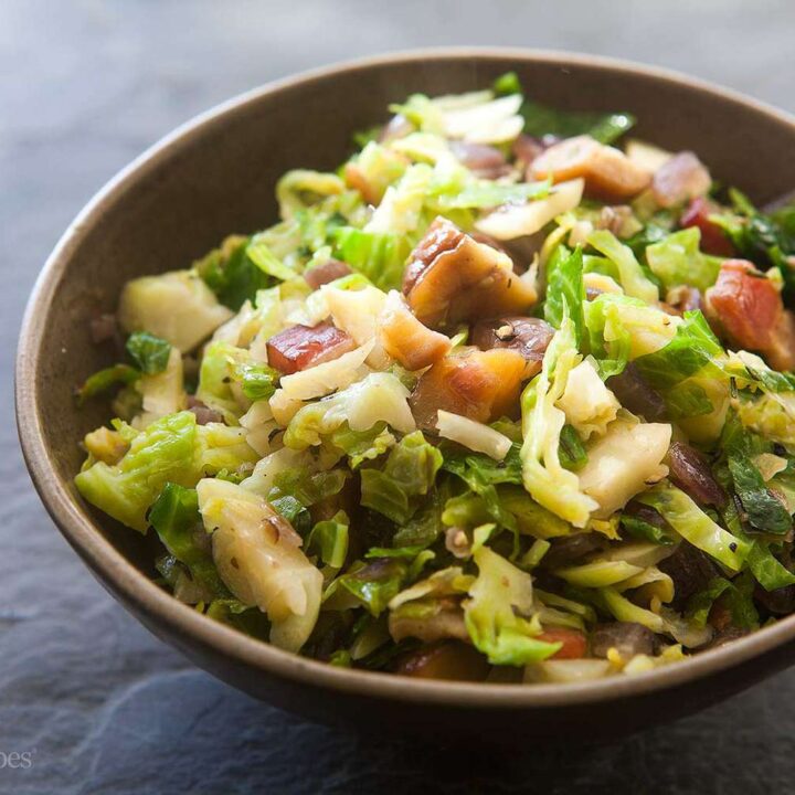 Thinly sliced Brussels sprouts are sautéed with bacon and onions, then tossed with roasted chestnuts and thyme. The combination of earthy sprouts, smoky bacon and sweet chestnuts creates a warm, filling side; a splash of lemon brightens the dish, and the method warns against overcooking to keep flavors fresh.