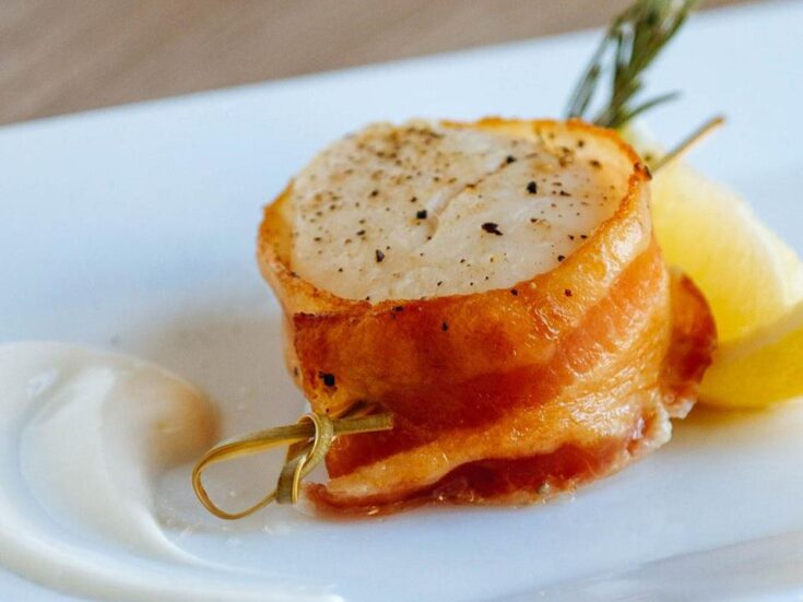 Juicy scallops wrapped in bacon and brushed lemon; these decadent bites are broiled to perfection and make a simple yet elegant appetiser