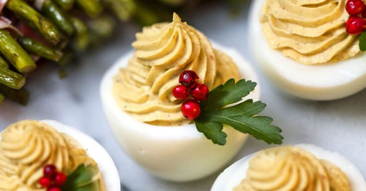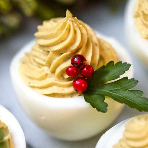 Classic deviled eggs topped with pomegranate seeds and parsley to resemble holly; these cute, festive bites are deliciously creamy and easy to whip up for Christmas.
