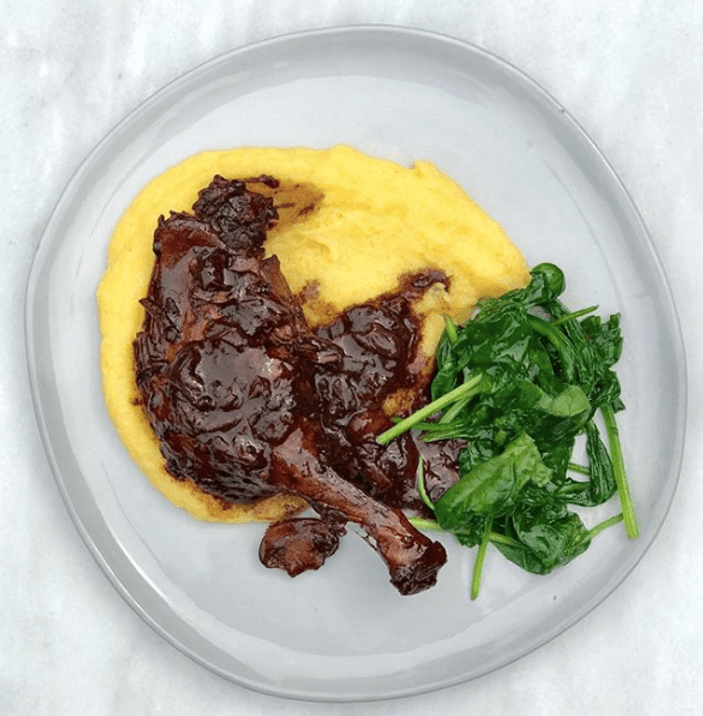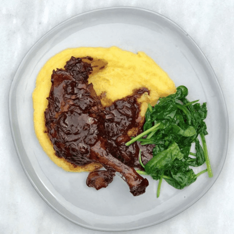 Duck Legs Braised in Red Wine with Polenta & Wilted Spinach
