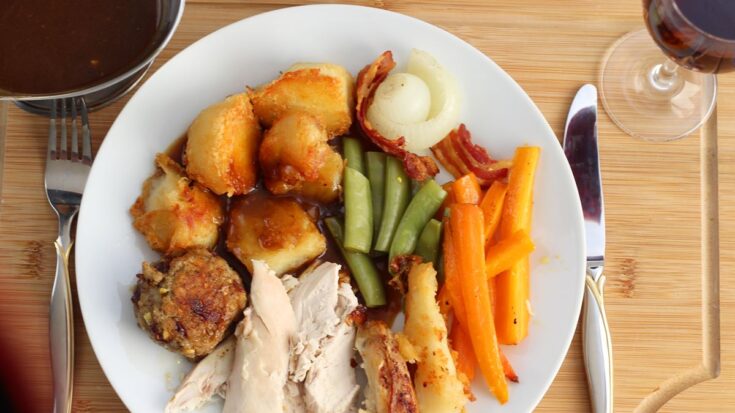 An economical alternative to turkey, this recipe roasts a whole chicken with butter and herbs and serves it alongside classic sides like roast potatoes and vegetables. It’s finished with Bisto gravy for a comforting British‑style Sunday dinner that also suits a holiday table.