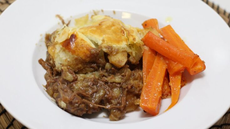 Slow‑braised chuck steak and onions simmer in red wine to make a rich, velvety filling encased in flaky pastry. The pie can be prepared ahead and even frozen, with flavours that improve overnight, making it an ideal make‑ahead main for feeding a crowd.