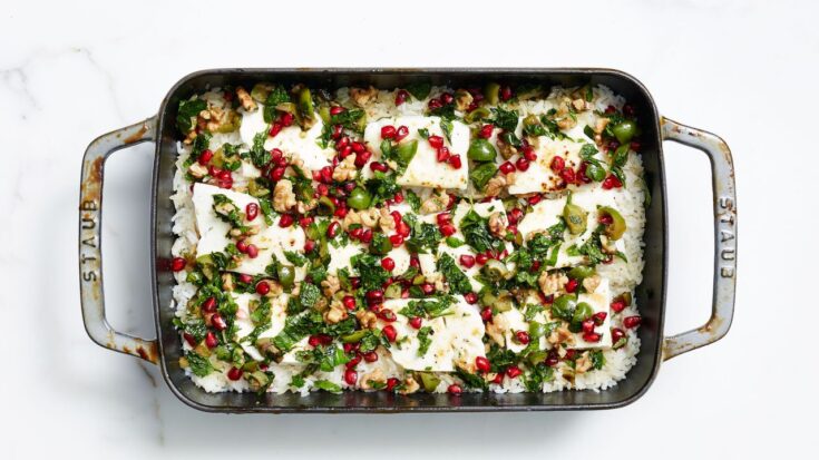 This hands‑off oven dish cooks rice until fluffy, then tops it with feta, toasted walnuts, mint and a sweet‑tart pomegranate relish. The colourful combination of creamy, nutty and fruity flavours creates a festive vegetarian main for holiday gatherings.