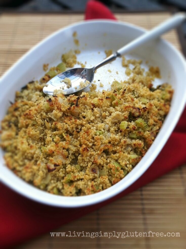 A gluten-free, vegan stuffing where cooked quinoa stands in for bread; it’s flavored with sage, onions and celery and is a wholesome whole-grain alternative.