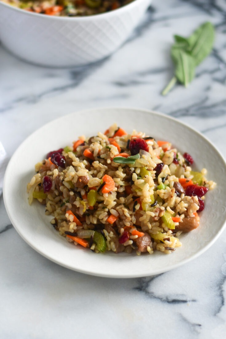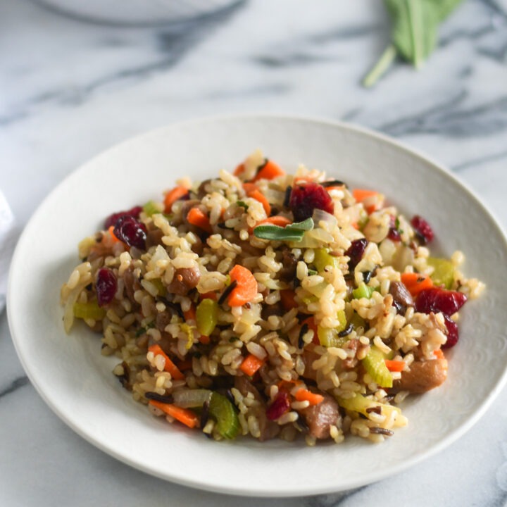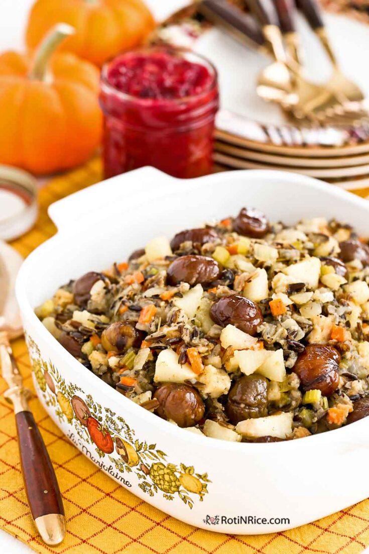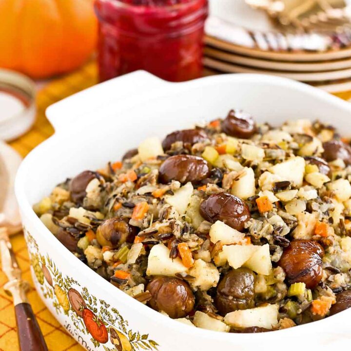 Vegan and gluten-free stuffing made with brown and wild rice cooked in vegetable broth, roasted chestnuts and fresh thyme and sage; it’s easy to prepare ahead and tastes even better the next day.
