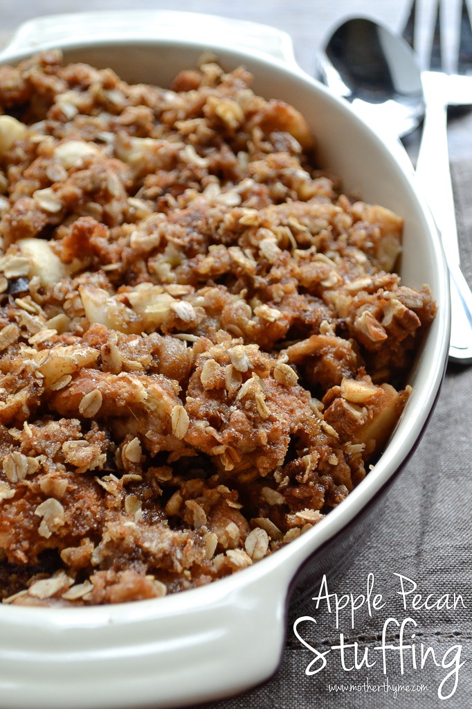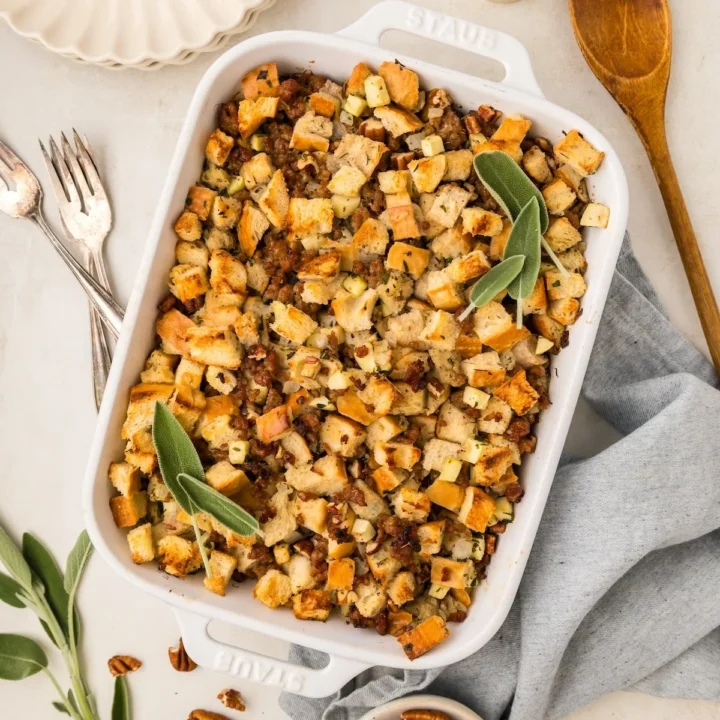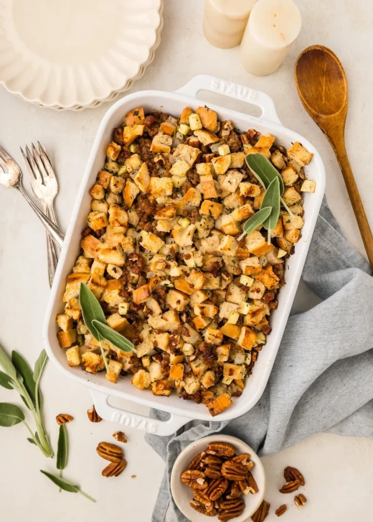 A salty-sweet stuffing using toasted pecans, fresh bread cubes, Italian sausage, apples and herbs like sage, thyme and parsley for a hearty, flavorful side.