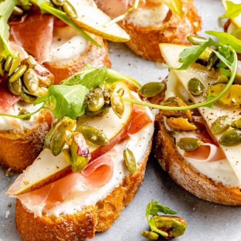 French baguette toasts spread with lemony ricotta, topped with sliced pears, salty prosciutto and a nut‑seed crunch mixture. Finished with honey and arugula, they offer a blend of creamy, sweet and salty flavours.