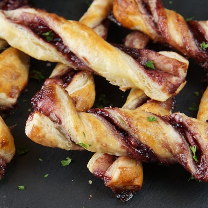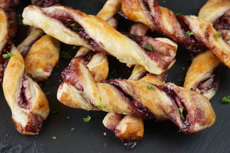 Puff pastry strips filled with swirls of blackberry jam and goat cheese, twisted and baked until golden. The sweet, tangy filling wrapped in buttery pastry creates a rich, fruity treat.