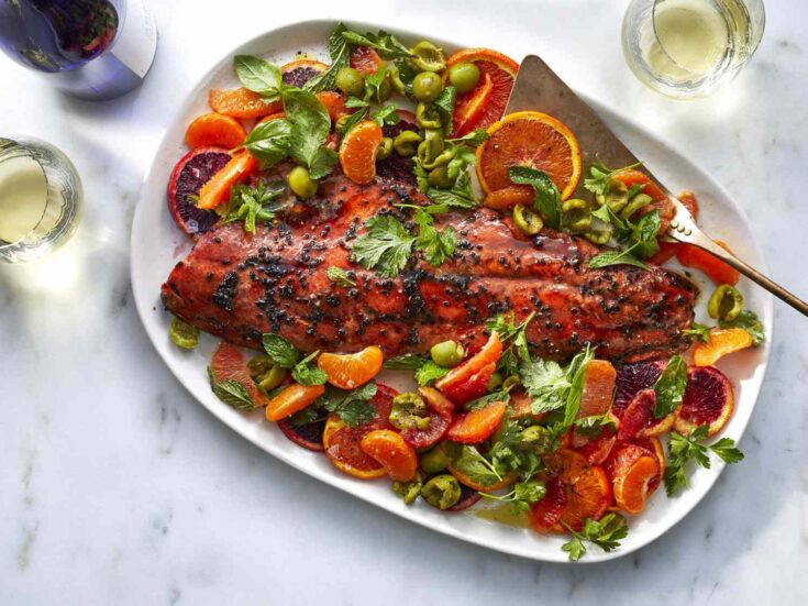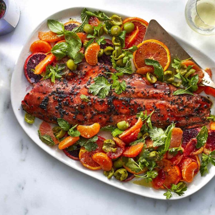 Pomegranate-Glazed Salmon with Oranges, Olives, and Herbs